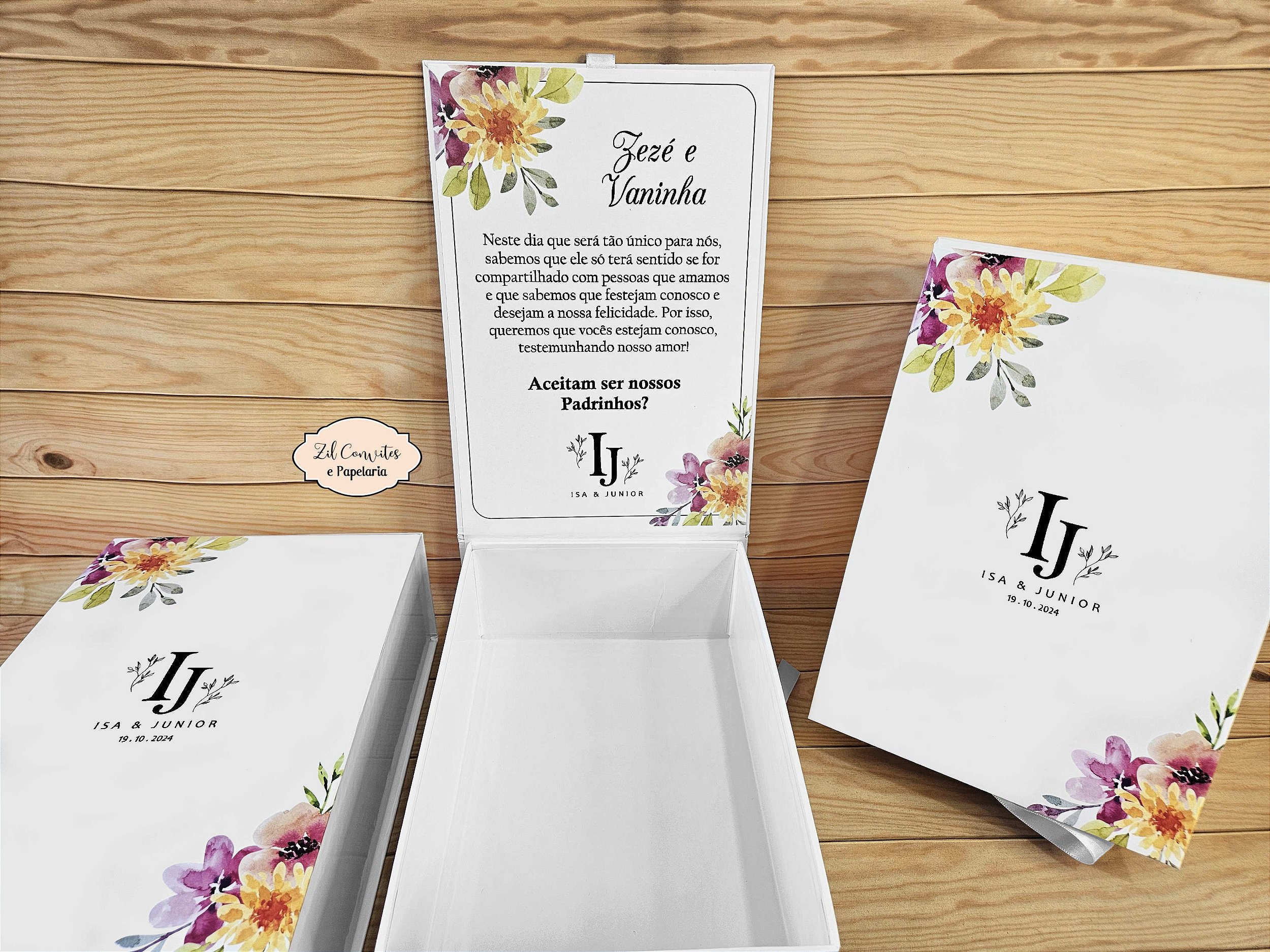 Material: Caixa rígida, produzida em cartonagem, com 2mm de espessura, laço de cetim ou fio e envelopamento brilhante.