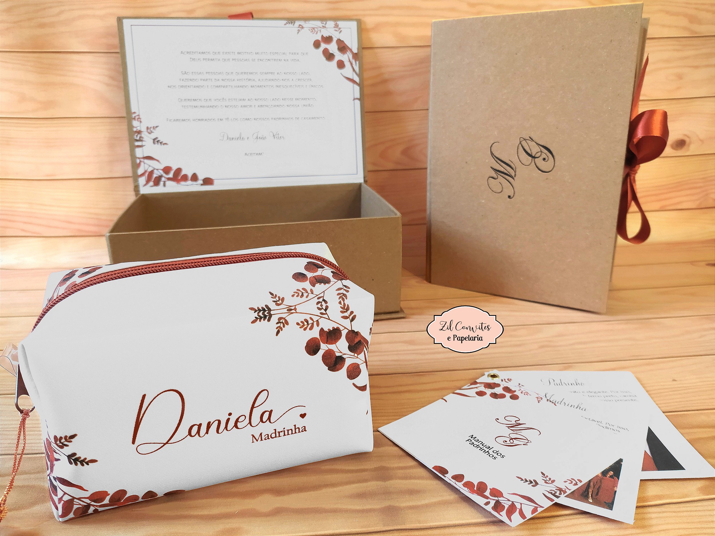 Material caixa: Caixa rígida, produzida em cartonagem, com 2mm de espessura, laço de cetim e envelopamento kraft.