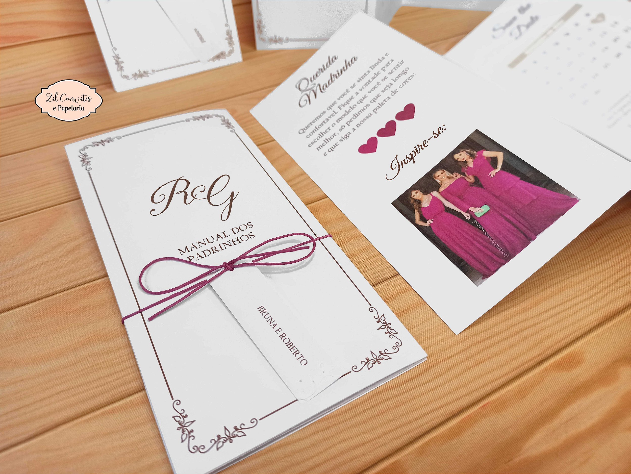 Material: Produzido em papel fosco 240g. Decorado com laço e tag com nomes dos padrinhos.